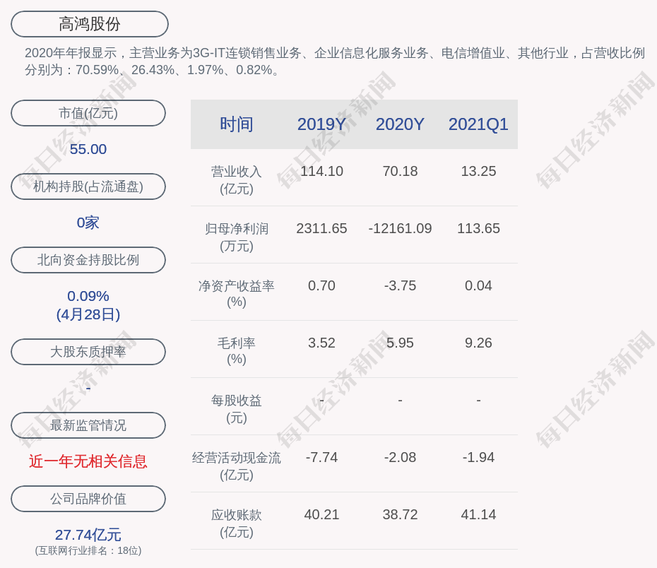 2020年年報(bào)顯示,高鴻股份的主營業(yè)務(wù)為3G-IT連鎖銷售業(yè)務(wù)、企業(yè)信息化服務(wù)業(yè)務(wù)、電信增值業(yè)、其他行業(yè),占營收比例分別為:70.59%、26.43%、1.97%、0.82%。