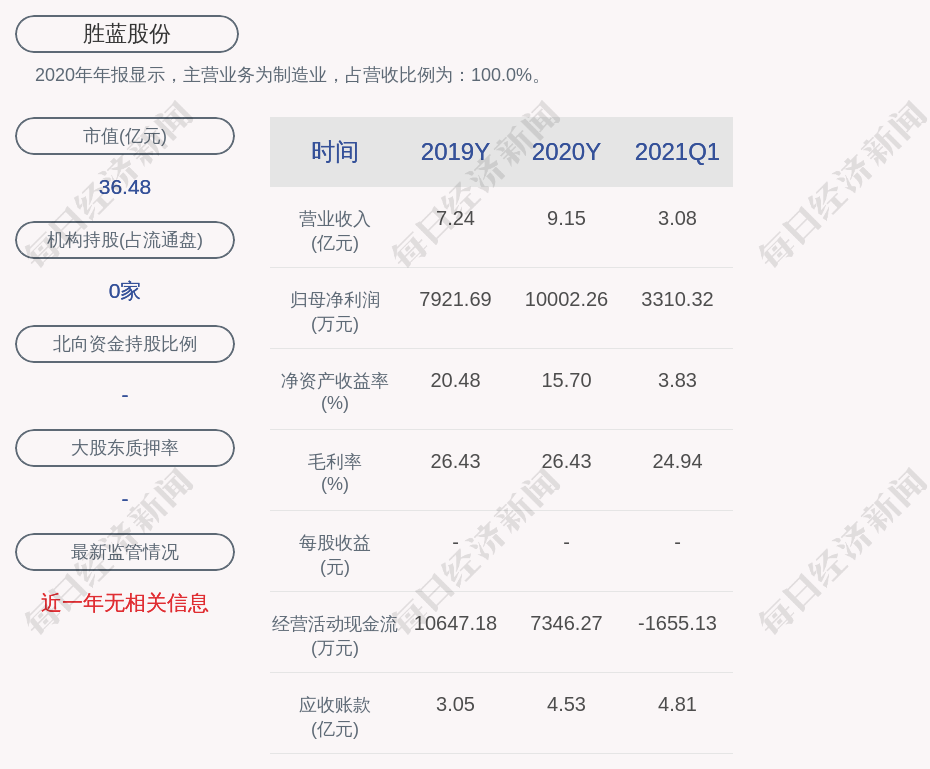 2020年年報顯示,勝藍股份的主營業(yè)務(wù)為制造業(yè),占營收比例為:100.0%。