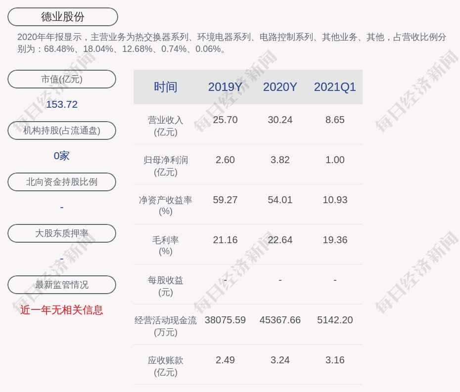 2020年年報(bào)顯示,德業(yè)股份的主營業(yè)務(wù)為熱交換器系列、環(huán)境電器系列、電路控制系列、其他業(yè)務(wù)、其他,占營收比例分別為:68.48%、18.04%、12.68%、0.74%、0.06%。