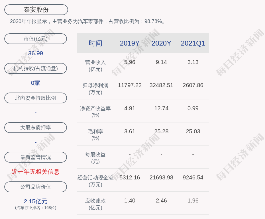 2020年年報顯示,秦安股份的主營業(yè)務為汽車零部件,占營收比例為:98.78%。
