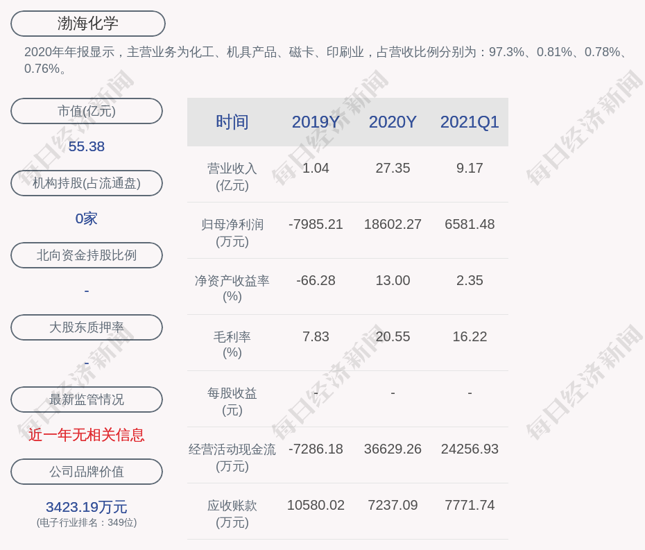 2020年年報(bào)顯示,渤海化學(xué)的主營業(yè)務(wù)為化工、機(jī)具產(chǎn)品、磁卡、印刷業(yè),占營收比例分別為:97.3%、0.81%、0.78%、0.76%。