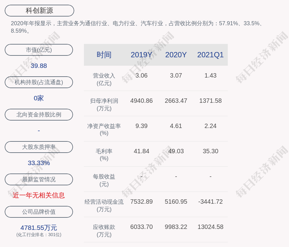 2020年年報顯示,科創(chuàng)新源的主營業(yè)務為通信行業(yè)、電力行業(yè)、汽車行業(yè),占營收比例分別為:57.91%、33.5%、8.59%。