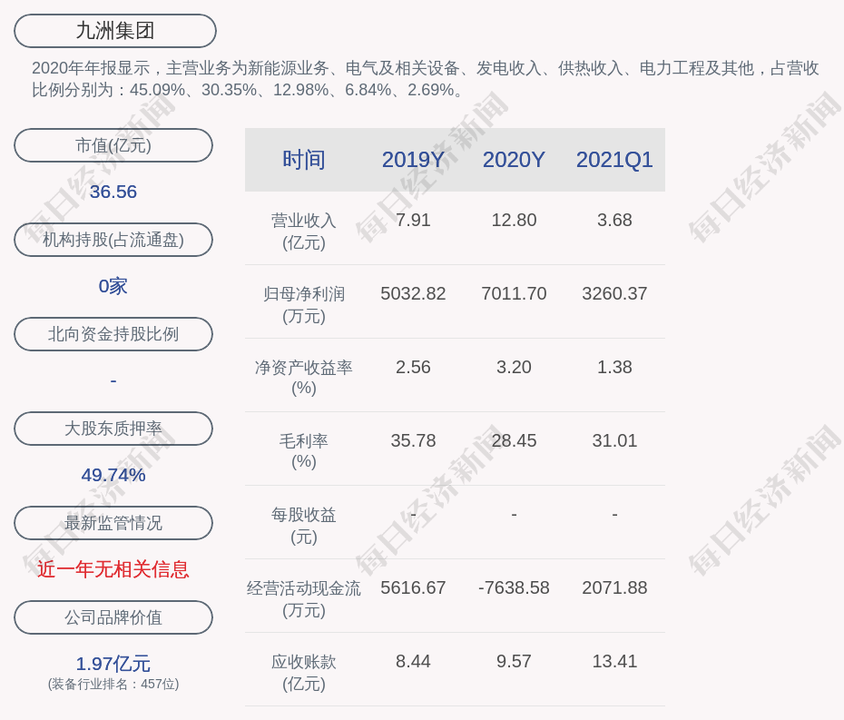 2020年年報(bào)顯示,九洲集團(tuán)的主營業(yè)務(wù)為新能源業(yè)務(wù)、電氣及相關(guān)設(shè)備、發(fā)電收入、供熱收入、電力工程及其他,占營收比例分別為:45.09%、30.35%、12.98%、6.84%、2.69%。