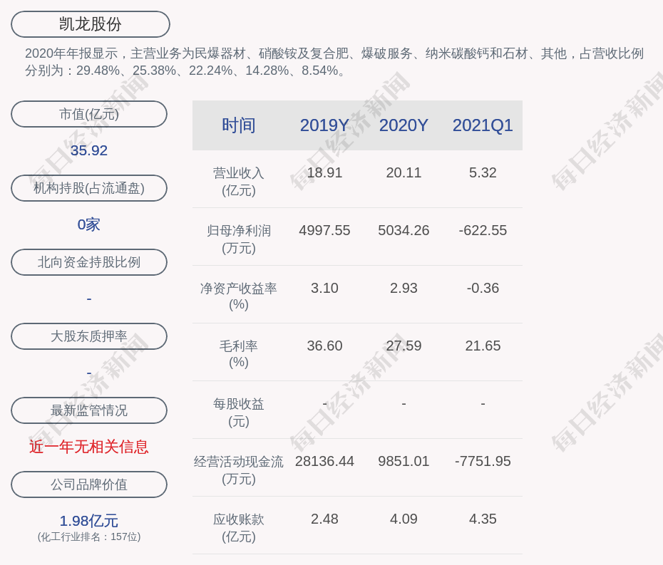 2020年年報(bào)顯示,凱龍股份的主營業(yè)務(wù)為民爆器材、硝酸銨及復(fù)合肥、爆破服務(wù)、納米碳酸鈣和石材、其他,占營收比例分別為:29.48%、25.38%、22.24%、14.28%、8.54%。