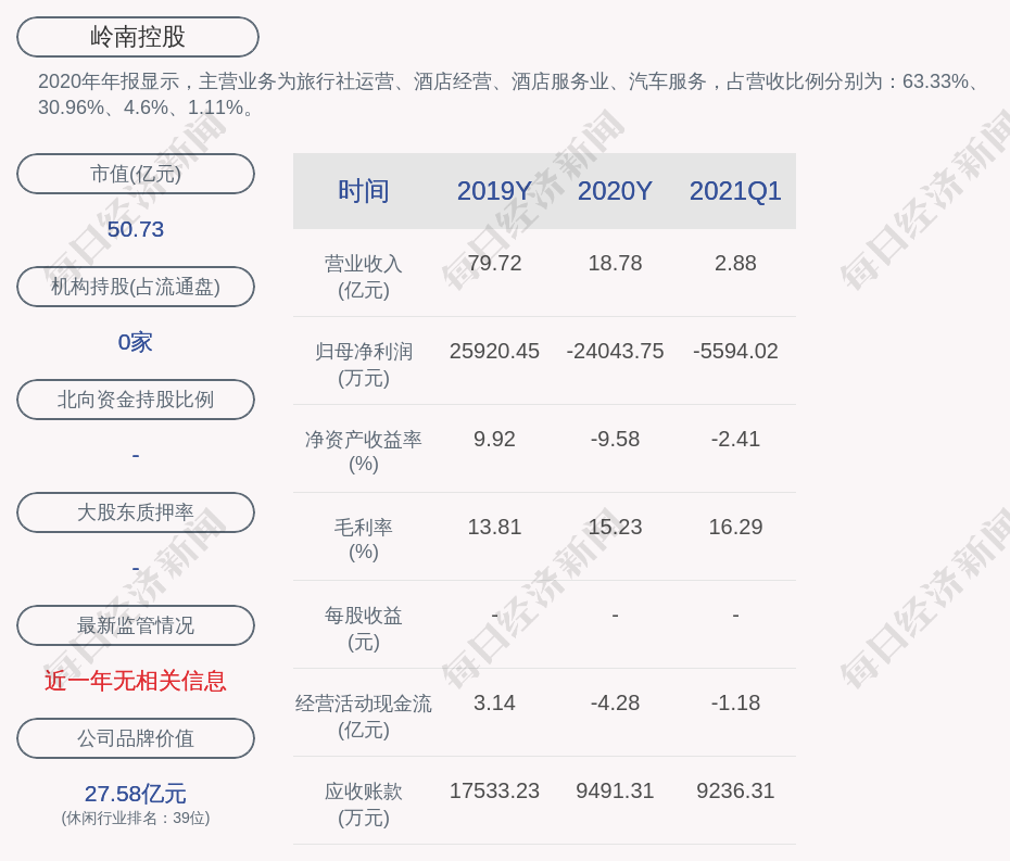 2020年年報(bào)顯示,嶺南控股的主營業(yè)務(wù)為旅行社運(yùn)營、酒店經(jīng)營、酒店服務(wù)業(yè)、汽車服務(wù),占營收比例分別為:63.33%、30.96%、4.6%、1.11%。