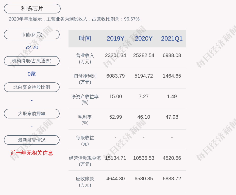2020年年報(bào)顯示,利揚(yáng)芯片的主營(yíng)業(yè)務(wù)為測(cè)試收入,占營(yíng)收比例為:96.67%。