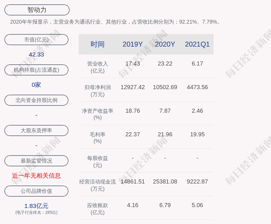 2020年年報顯示,智動力的主營業(yè)務為通訊行業(yè)、其他行業(yè),占營收比例分別為:92.21%、7.79%。