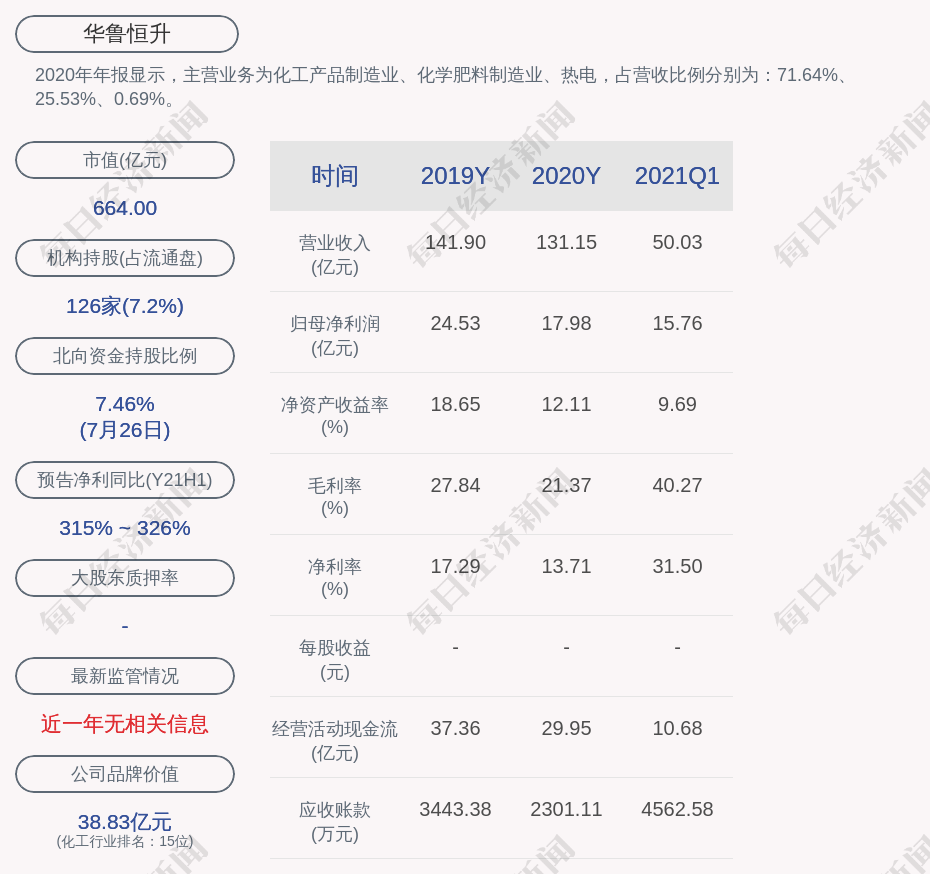 2020年年報(bào)顯示,華魯恒升的主營(yíng)業(yè)務(wù)為化工產(chǎn)品制造業(yè)、化學(xué)肥料制造業(yè)、熱電,占營(yíng)收比例分別為:71.64%、25.53%、0.69%。