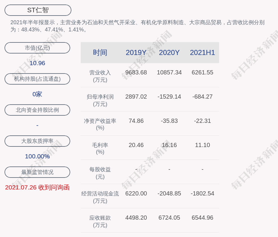 2021年半年報(bào)顯示,ST仁智的主營(yíng)業(yè)務(wù)為石油和天然氣開(kāi)采業(yè)、有機(jī)化學(xué)原料制造、大宗商品貿(mào)易,占營(yíng)收比例分別為:48.43%、47.41%、1.41%。