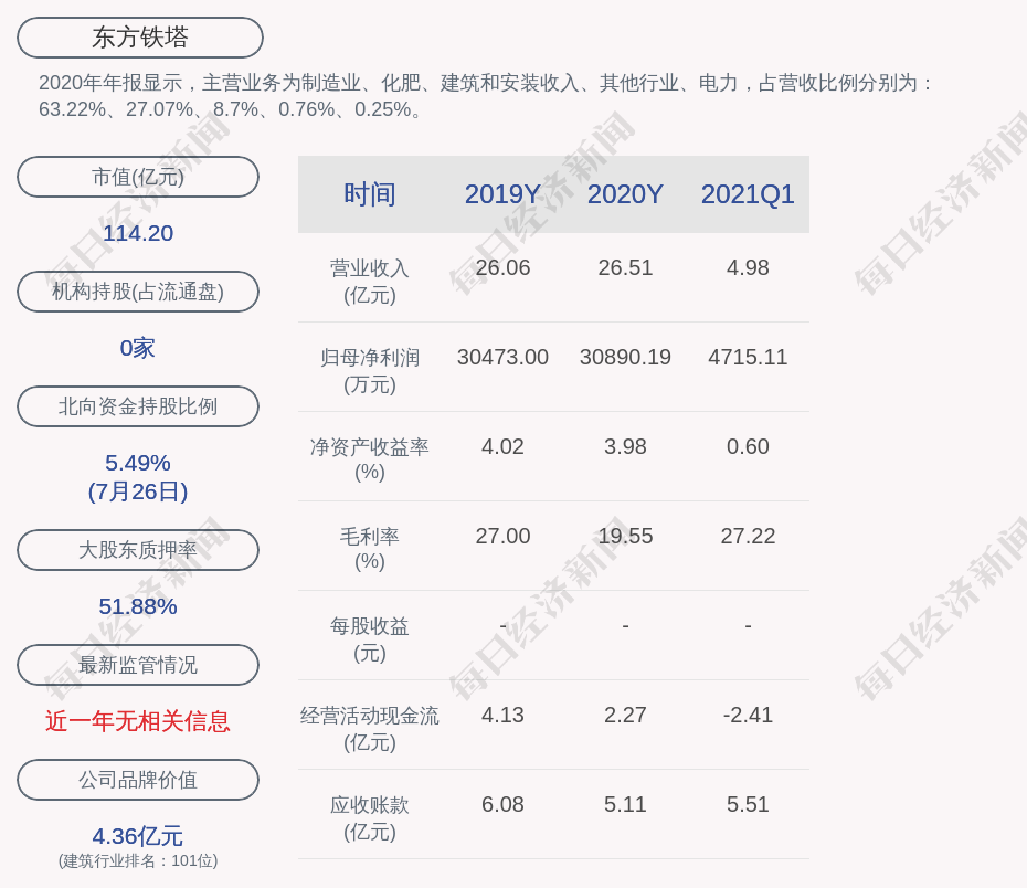 2020年年報顯示,東方鐵塔的主營業(yè)務為制造業(yè)、化肥、建筑和安裝收入、其他行業(yè)、電力,占營收比例分別為:63.22%、27.07%、8.7%、0.76%、0.25%。