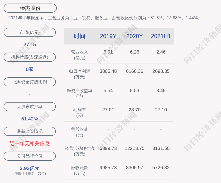 2021年半年報(bào)顯示,棒杰股份的主營(yíng)業(yè)務(wù)為工業(yè)、貿(mào)易、服務(wù)業(yè),占營(yíng)收比例分別為:81.5%、13.88%、1.44%。