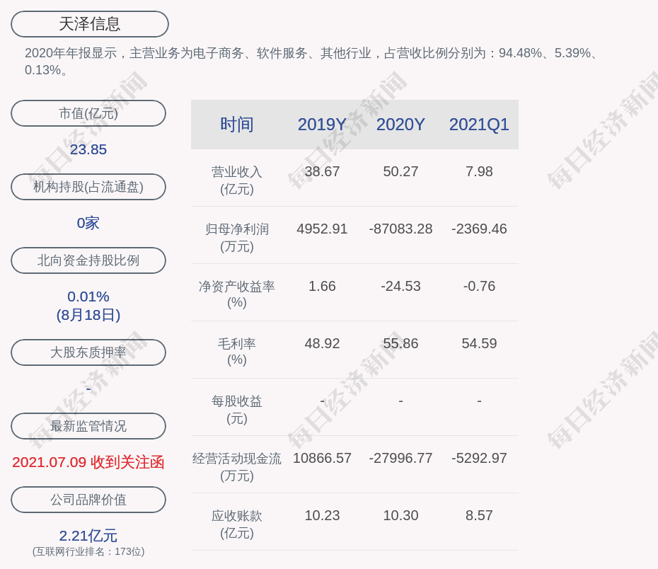 2020年年報(bào)顯示,天澤信息的主營業(yè)務(wù)為電子商務(wù)、軟件服務(wù)、其他行業(yè),占營收比例分別為:94.48%、5.39%、0.13%。