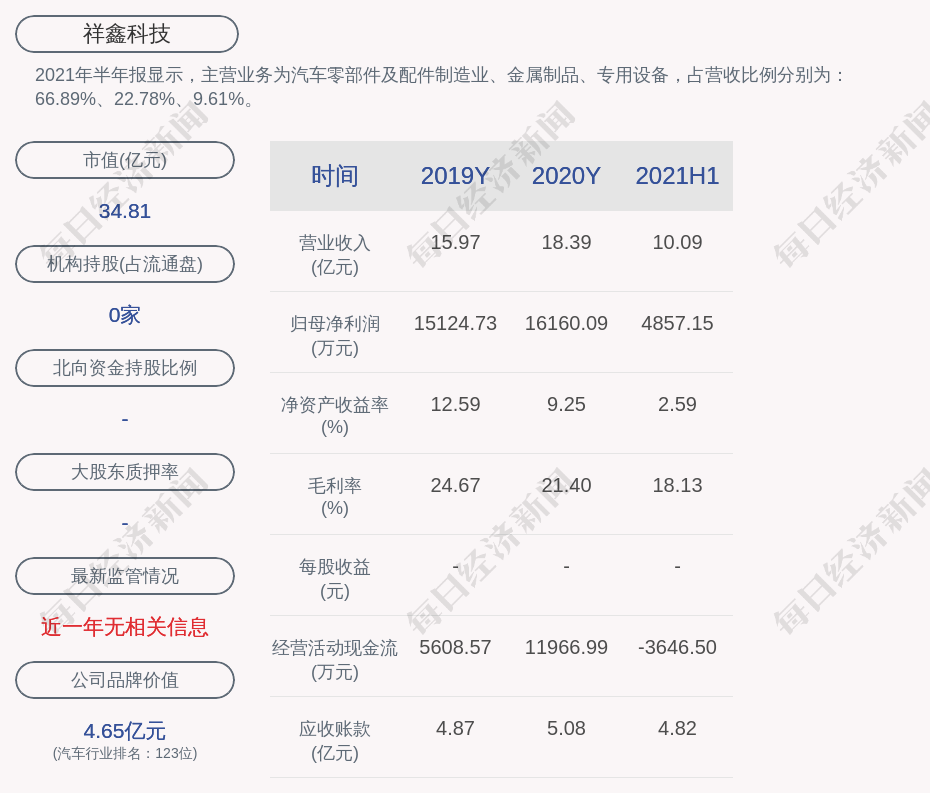 2021年半年報顯示,祥鑫科技的主營業(yè)務(wù)為汽車零部件及配件制造業(yè)、金屬制品、專用設(shè)備,占營收比例分別為:66.89%、22.78%、9.61%。