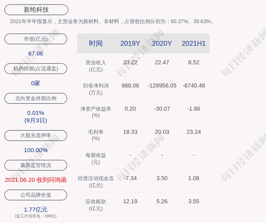 2021年半年報顯示,新綸科技的主營業(yè)務(wù)為新材料、非材料,占營收比例分別為:60.37%、39.63%。