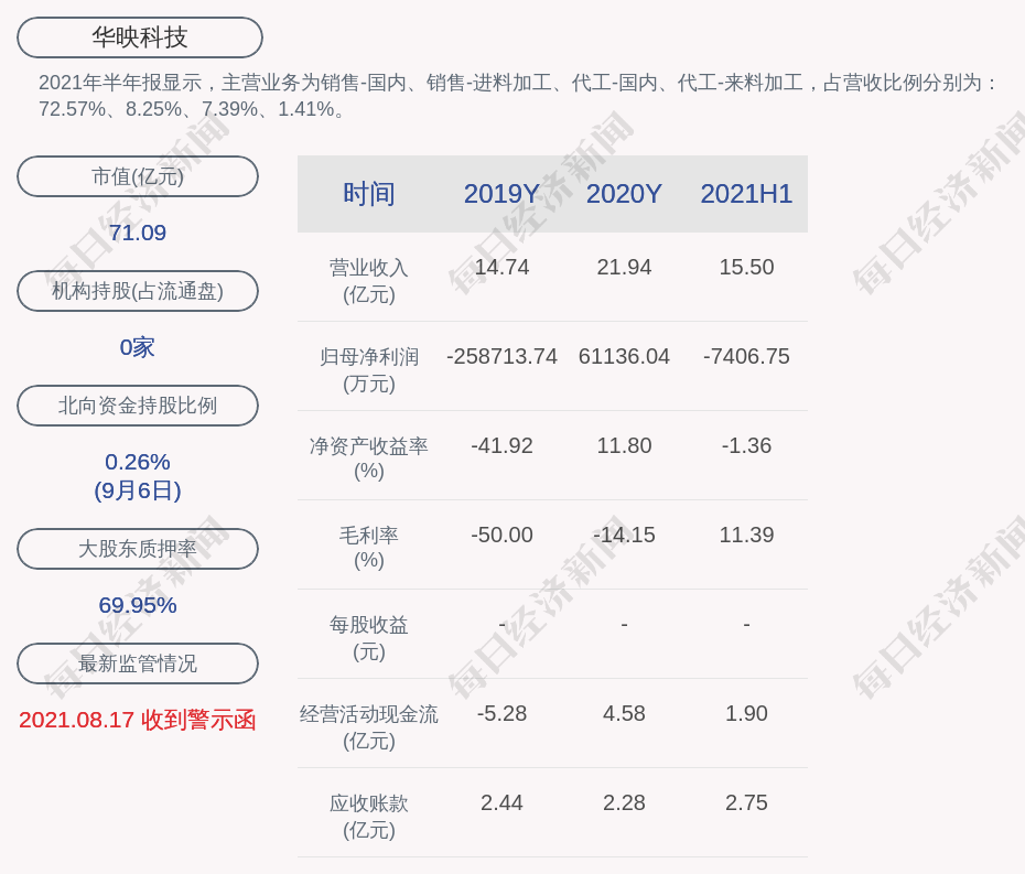 2021年半年報(bào)顯示,華映科技的主營(yíng)業(yè)務(wù)為銷(xiāo)售-國(guó)內(nèi)、銷(xiāo)售-進(jìn)料加工、代工-國(guó)內(nèi)、代工-來(lái)料加工,占營(yíng)收比例分別為:72.57%、8.25%、7.39%、1.41%。