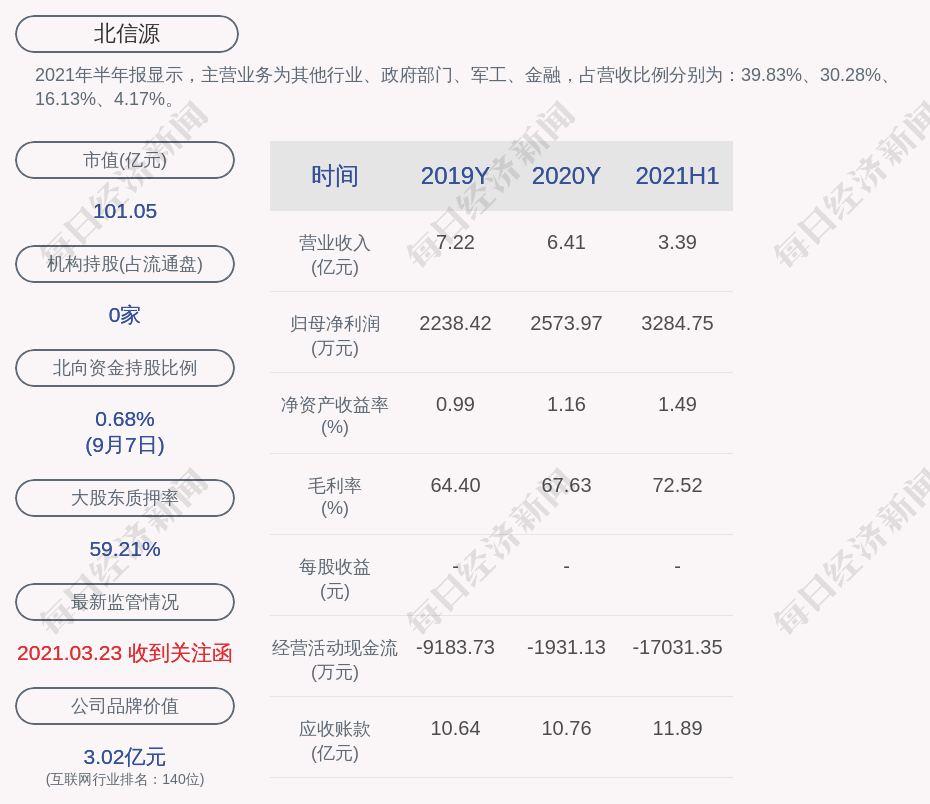 2021年半年報顯示,北信源的主營業(yè)務(wù)為其他行業(yè)、政府部門、軍工、金融,占營收比例分別為:39.83%、30.28%、16.13%、4.17%。