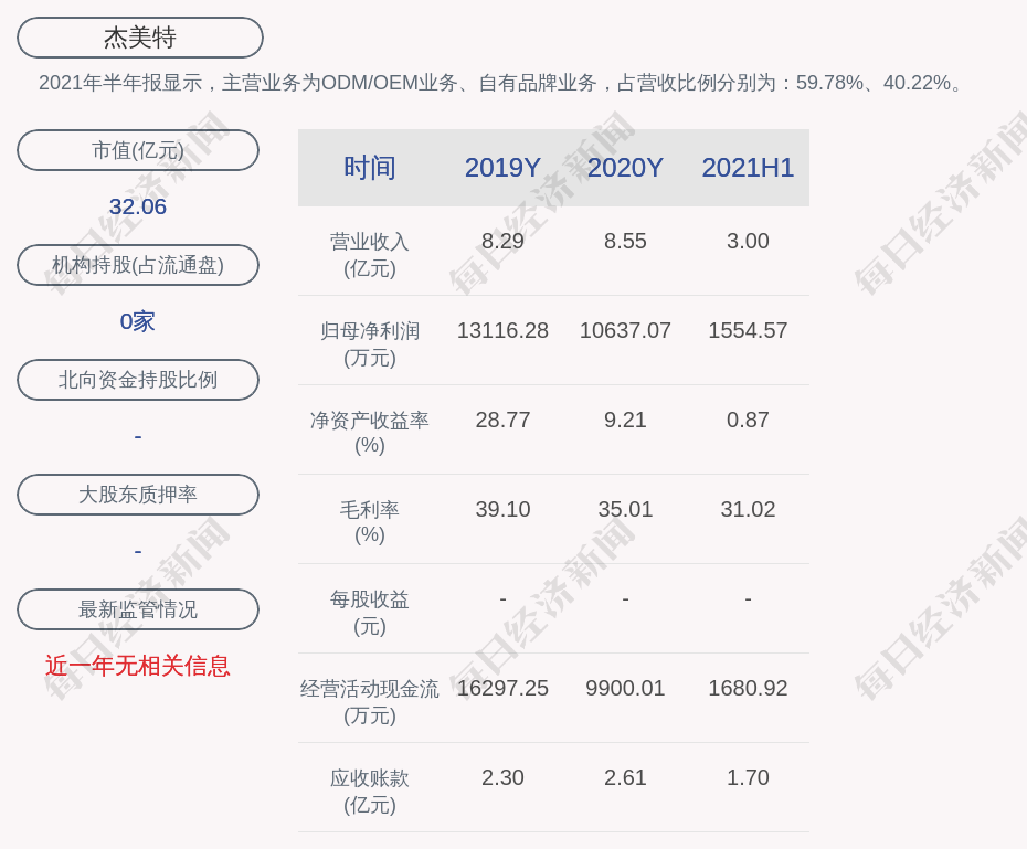 2021年半年報(bào)顯示,杰美特的主營(yíng)業(yè)務(wù)為ODM/OEM業(yè)務(wù)、自有品牌業(yè)務(wù),占營(yíng)收比例分別為:59.78%、40.22%。