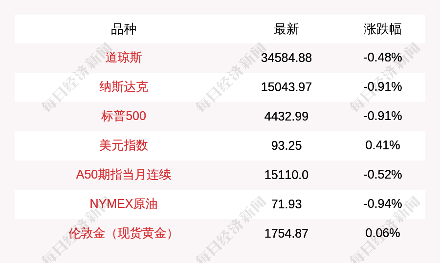 每經(jīng)AI快訊:北京時(shí)間9月18日04:00,道瓊斯收盤下跌166.44點(diǎn),跌幅為0.48%,報(bào)34584.88點(diǎn);納斯達(dá)克收盤下跌137.95點(diǎn),跌幅為0.91%,報(bào)15043.97點(diǎn);標(biāo)普500收盤下跌40.76點(diǎn),跌幅為0.91%,報(bào)4432.99點(diǎn);富時(shí)中國A50指數(shù)期貨下跌79.0點(diǎn),跌幅為0.52%,報(bào)15110.0點(diǎn);NYMEX原油收盤下跌0.68點(diǎn),跌幅為0.94%,報(bào)71.93點(diǎn);美元指數(shù)收盤上漲0.38點(diǎn),漲幅為0.41%,報(bào)93.25點(diǎn);倫敦金(現(xiàn)貨黃金)收盤上漲1.1點(diǎn),漲幅為0.06%,報(bào)1754.87點(diǎn)。