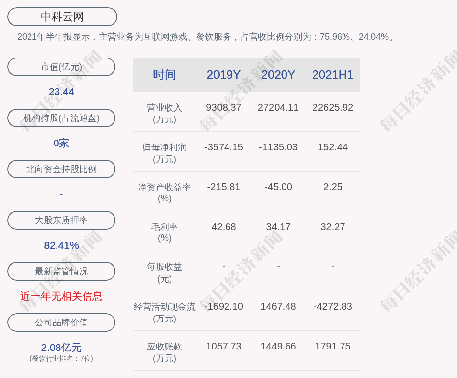 2021年半年報(bào)顯示,中科云網(wǎng)的主營業(yè)務(wù)為互聯(lián)網(wǎng)游戲、餐飲服務(wù),占營收比例分別為:75.96%、24.04%。
