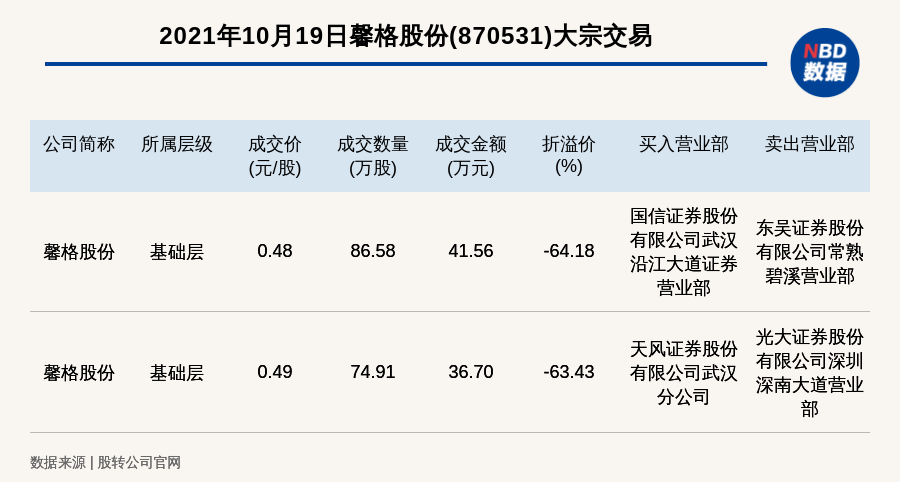 每經(jīng)AI快訊,2021年10月19日,新三板基礎(chǔ)層公司馨格股份(870531)發(fā)生2筆大宗交易,折價(jià)率最高的一筆成交價(jià)0.48元/股,成交數(shù)量86.58萬股,成交金額41.56萬元,折價(jià)64.18%。買入營業(yè)部是國信證券股份有限公司武漢沿江大道證券營業(yè)部,賣出營業(yè)部是東吳證券股份有限公司常熟碧溪營業(yè)部。