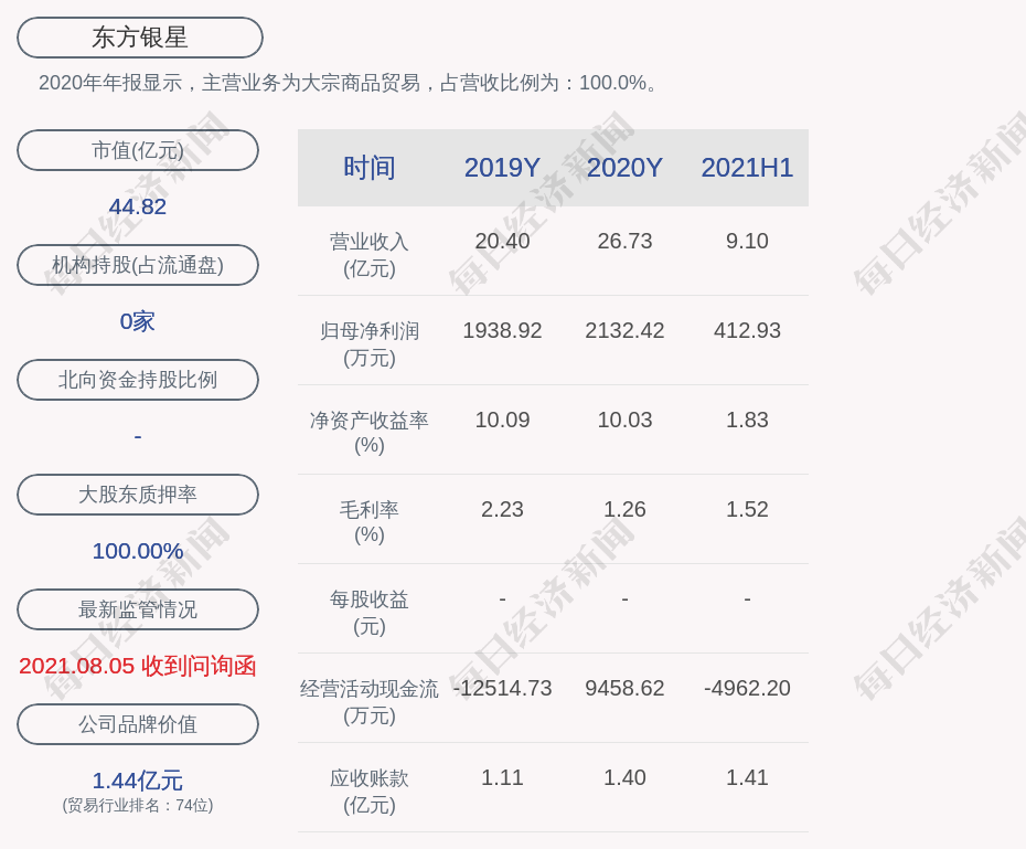 2020年年報(bào)顯示,東方銀星的主營(yíng)業(yè)務(wù)為大宗商品貿(mào)易,占營(yíng)收比例為:100.0%。