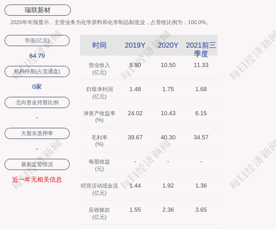 2020年年報顯示,瑞聯(lián)新材的主營業(yè)務(wù)為化學(xué)原料和化學(xué)制品制造業(yè),占營收比例為:100.0%。