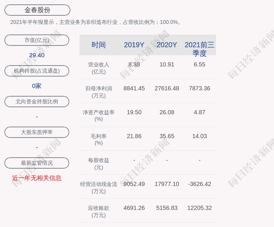 2021年半年報顯示,金春股份的主營業(yè)務(wù)為非織造布行業(yè),占營收比例為:100.0%。