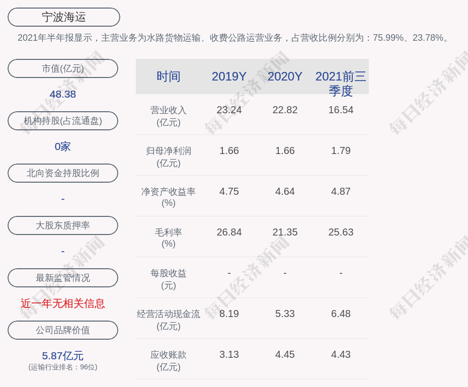 2021年半年報顯示,寧波海運的主營業(yè)務(wù)為水路貨物運輸、收費公路運營業(yè)務(wù),占營收比例分別為:75.99%、23.78%。