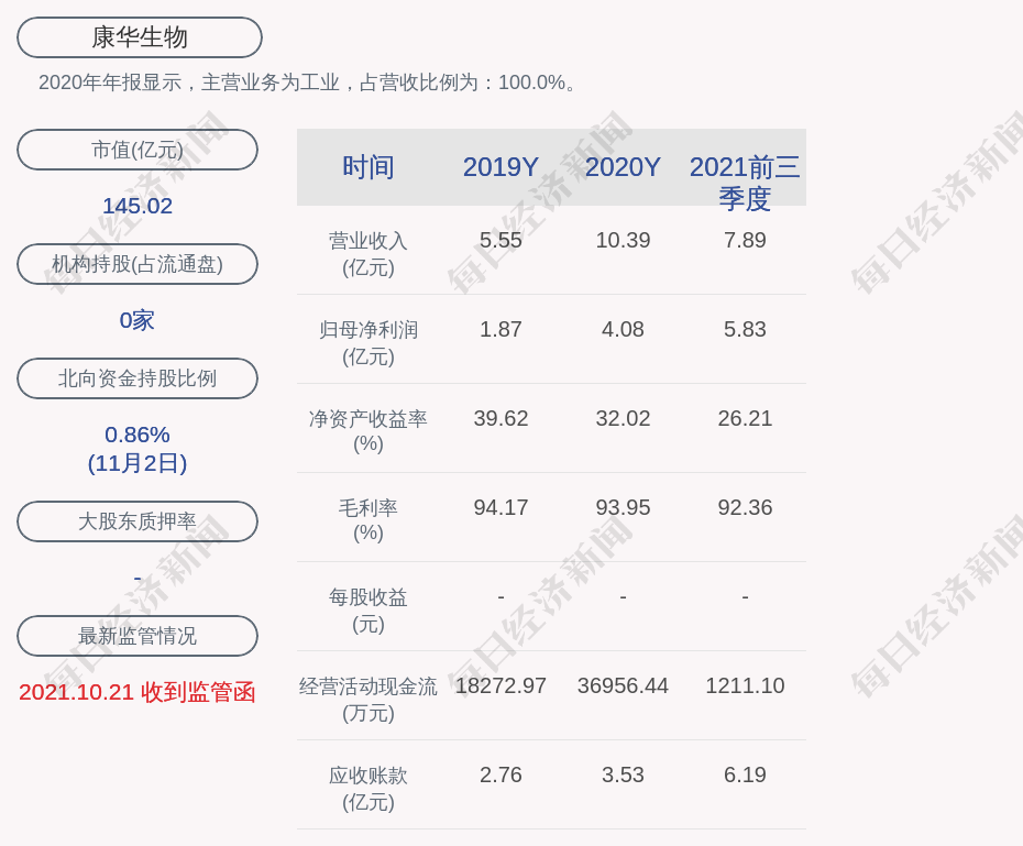 2020年年報顯示,康華生物的主營業(yè)務(wù)為工業(yè),占營收比例為:100.0%。