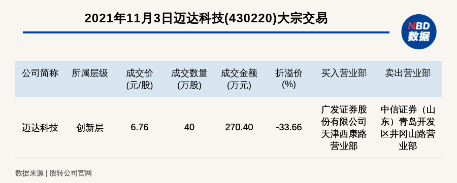 每經(jīng)訊,2021年11月3日,新三板創(chuàng)新層公司邁達科技(430220)發(fā)生一筆大宗交易,成交價6.76元/股,成交數(shù)量40萬股,成交金額270.40萬元,折價33.66%。買入營業(yè)部是廣發(fā)證券股份有限公司天津西康路營業(yè)部,賣出營業(yè)部是中信證券(山東)青島開發(fā)區(qū)井岡山路營業(yè)部。