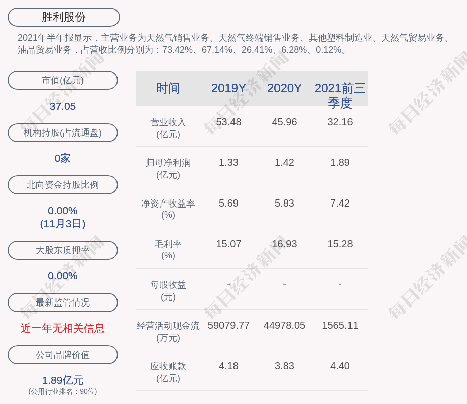 2021年半年報顯示,勝利股份的主營業(yè)務(wù)為天然氣銷售業(yè)務(wù)、天然氣終端銷售業(yè)務(wù)、其他塑料制造業(yè)、天然氣貿(mào)易業(yè)務(wù)、油品貿(mào)易業(yè)務(wù),占營收比例分別為:73.42%、67.14%、26.41%、6.28%、0.12%。