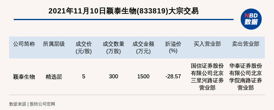 每經(jīng)訊,2021年11月10日,新三板精選層公司穎泰生物(833819)發(fā)生一筆大宗交易,成交價5元/股,成交數(shù)量300萬股,成交金額1500萬元,折價28.57%。買入營業(yè)部是國信證券股份有限公司北京三里河路證券營業(yè)部,賣出營業(yè)部是華泰證券股份有限公司北京學院南路證券營業(yè)部。