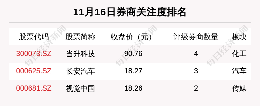 從券商對(duì)個(gè)股的關(guān)注程度來(lái)看,有3只個(gè)股獲得多家券商關(guān)注,券商關(guān)注數(shù)量排名居前的個(gè)股是當(dāng)升科技(300073.SZ)、長(zhǎng)安汽車(chē)(000625.SZ)、視覺(jué)中國(guó)(000681.SZ)。