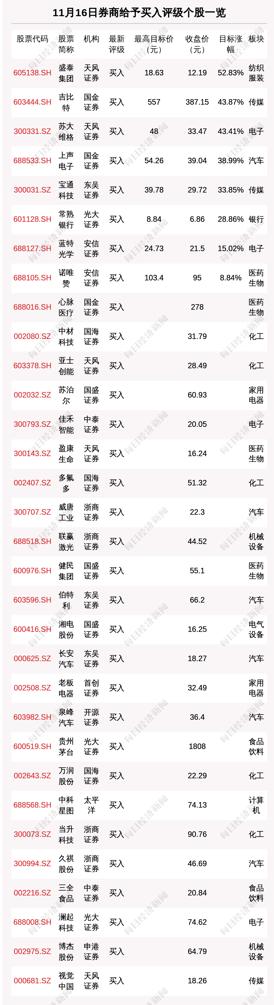 每經(jīng)AI快訊,11月16日,券商給予評(píng)級(jí)的個(gè)股數(shù)共有40只,獲得買(mǎi)入評(píng)級(jí)的個(gè)股數(shù)共有32只。在公布了目標(biāo)價(jià)格的8只個(gè)股中,按照最新收盤(pán)價(jià)計(jì)算,預(yù)期漲幅排名居前的個(gè)股是盛泰集團(tuán)(605138.SH)、吉比特(603444.SH)、蘇大維格(300331.SZ),預(yù)期漲幅分別是52.83%、43.87%、43.41%。