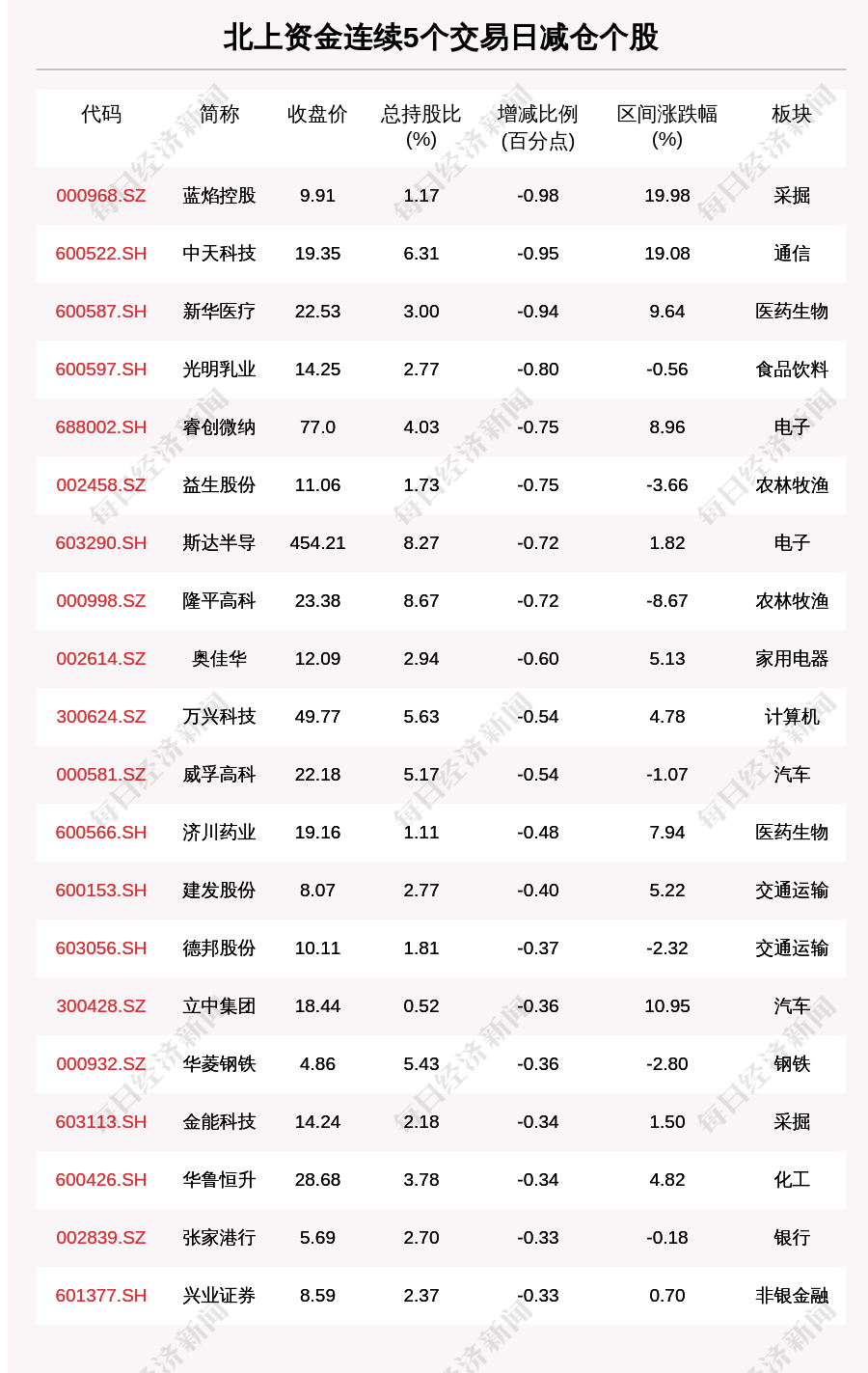 每經(jīng)AI快訊,11月17日,北上資金連續(xù)5個(gè)交易日賣出46個(gè)股。北上資金連續(xù)5個(gè)交易日減倉(cāng)個(gè)股中,藍(lán)焰控股(000968.SZ,收盤價(jià):9.91元)減持比例增幅最大,5個(gè)交易日減持0.98百分點(diǎn),其他跌幅較大的個(gè)股包括中天科技(600522.SH,收盤價(jià):19.35元)、新華醫(yī)療(600587.SH,收盤價(jià):22.53元)、光明乳業(yè)(600597.SH,收盤價(jià):14.25元),分別減持0.95個(gè)百分點(diǎn)、0.94個(gè)百分點(diǎn)、0.80個(gè)百分點(diǎn)。