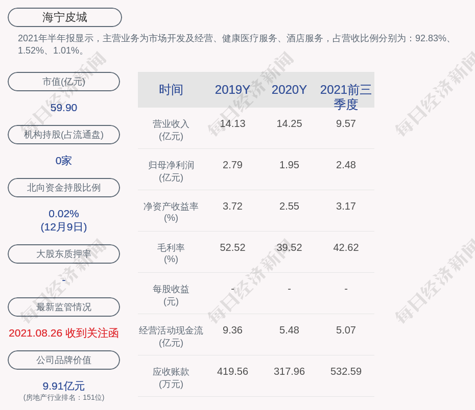 2021年半年報顯示,海寧皮城的主營業(yè)務(wù)為市場開發(fā)及經(jīng)營、健康醫(yī)療服務(wù)、酒店服務(wù),占營收比例分別為:92.83%、1.52%、1.01%。