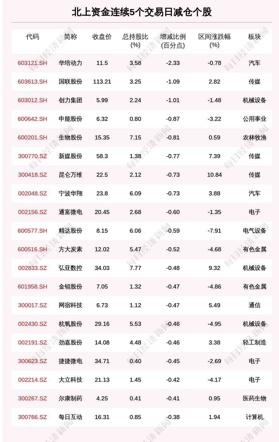 每經(jīng)AI快訊,12月13日,北上資金連續(xù)5個(gè)交易日賣(mài)出55個(gè)股。北上資金連續(xù)5個(gè)交易日減倉(cāng)個(gè)股中,華培動(dòng)力(603121.SH,收盤(pán)價(jià):11.5元)減持比例增幅最大,5個(gè)交易日減持2.33百分點(diǎn),其他跌幅較大的個(gè)股包括國(guó)聯(lián)股份(603613.SH,收盤(pán)價(jià):113.21元)、創(chuàng)力集團(tuán)(603012.SH,收盤(pán)價(jià):5.99元)、申能股份(600642.SH,收盤(pán)價(jià):6.32元),分別減持1.09個(gè)百分點(diǎn)、1.01個(gè)百分點(diǎn)、0.87個(gè)百分點(diǎn)。