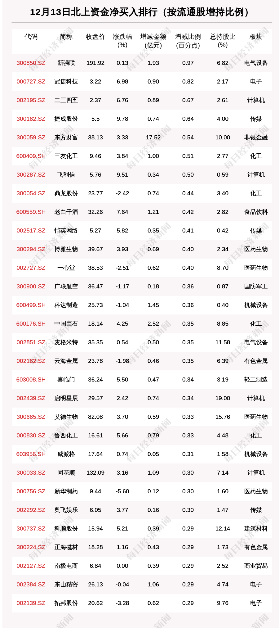 每經(jīng)AI快訊,12月13日,北上資金凈買入的個股共有617只,北上資金加倉比例超1%的有514只。其中,新強聯(lián)(300850.SZ,收盤價:191.92元)加倉比例最為明顯,最新持股比例6.82%,環(huán)比增加0.97個百分點。其他北上資金加倉比例較多的個股還包括冠捷科技(000727.SZ,收盤價:3.22元)、二三四五(002195.SZ,收盤價:2.37元)、捷成股份(300182.SZ,收盤價:5.5元)。