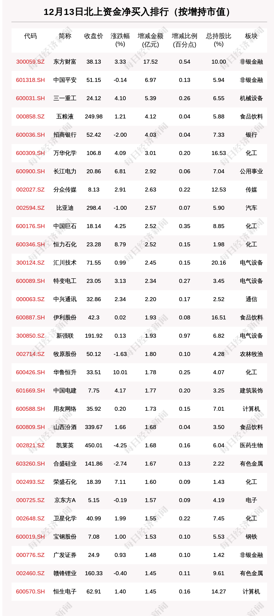 12月13日,按照北向資金增持市值排序,東方財富(300059.SZ,收盤價:38.13元)增持市值最大,增持市值17.524億元,環(huán)比增加5.88%。其他北上資金增持市值較多的個股還包括中國平安(601318.SH,收盤價:51.15元)、三一重工(600031.SH,收盤價:24.12元)、五糧液(000858.SZ,收盤價:249.98元)。