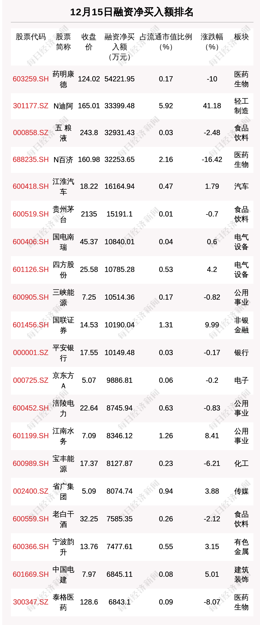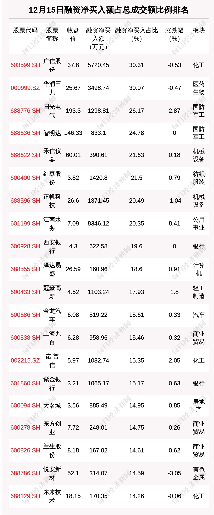 12月15日兩市共有1093只個股有融資資金凈買入。共有49只股票融資凈買入額占總成交金額比例超10%,其中廣信股份、華潤三九、國光電氣排名前三,占比分別為30.31%、30.07%、26.17%。