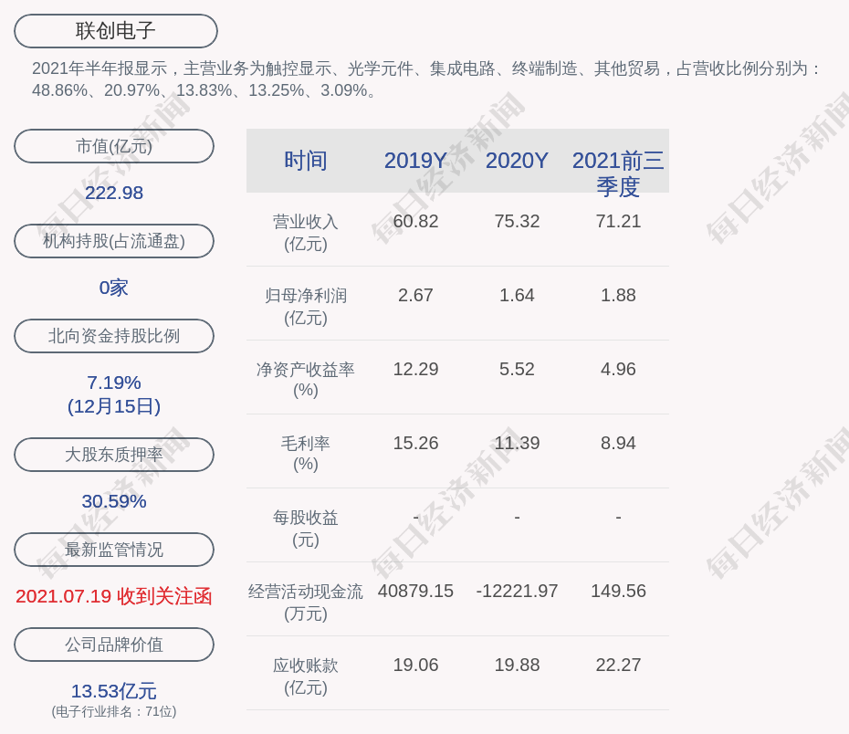 2021年半年報顯示,聯(lián)創(chuàng)電子的主營業(yè)務(wù)為觸控顯示、光學(xué)元件、集成電路、終端制造、其他貿(mào)易,占營收比例分別為:48.86%、20.97%、13.83%、13.25%、3.09%。