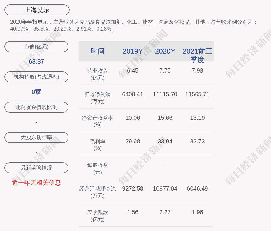 2020年年報(bào)顯示,上海艾錄的主營(yíng)業(yè)務(wù)為食品及食品添加劑、化工、建材、醫(yī)藥及化妝品、其他,占營(yíng)收比例分別為:40.97%、35.5%、20.29%、2.91%、0.28%。