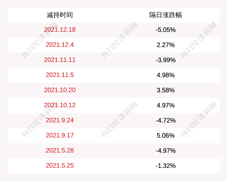 3. *ST眾泰上次發(fā)布減持公告是2021年12月18日,第二個(gè)交易日下跌5.05%,*ST眾泰近一年共發(fā)布11次減持類公告。