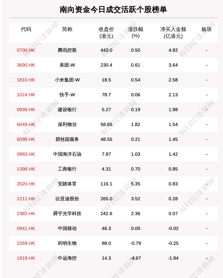南向資金成交活躍個股榜單中,凈買入個股共12只,金額最多的是騰訊控股(0700.HK,收盤價:443.0港元),凈買入4.821億港元;凈賣出個股共3只,金額最多的是中遠海控(1919.HK,收盤價:14.3港元),凈賣出1.836億港元。