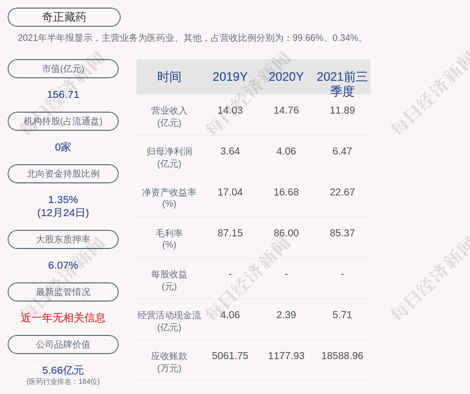 2021年半年報顯示,奇正藏藥的主營業(yè)務為醫(yī)藥業(yè)、其他,占營收比例分別為:99.66%、0.34%。