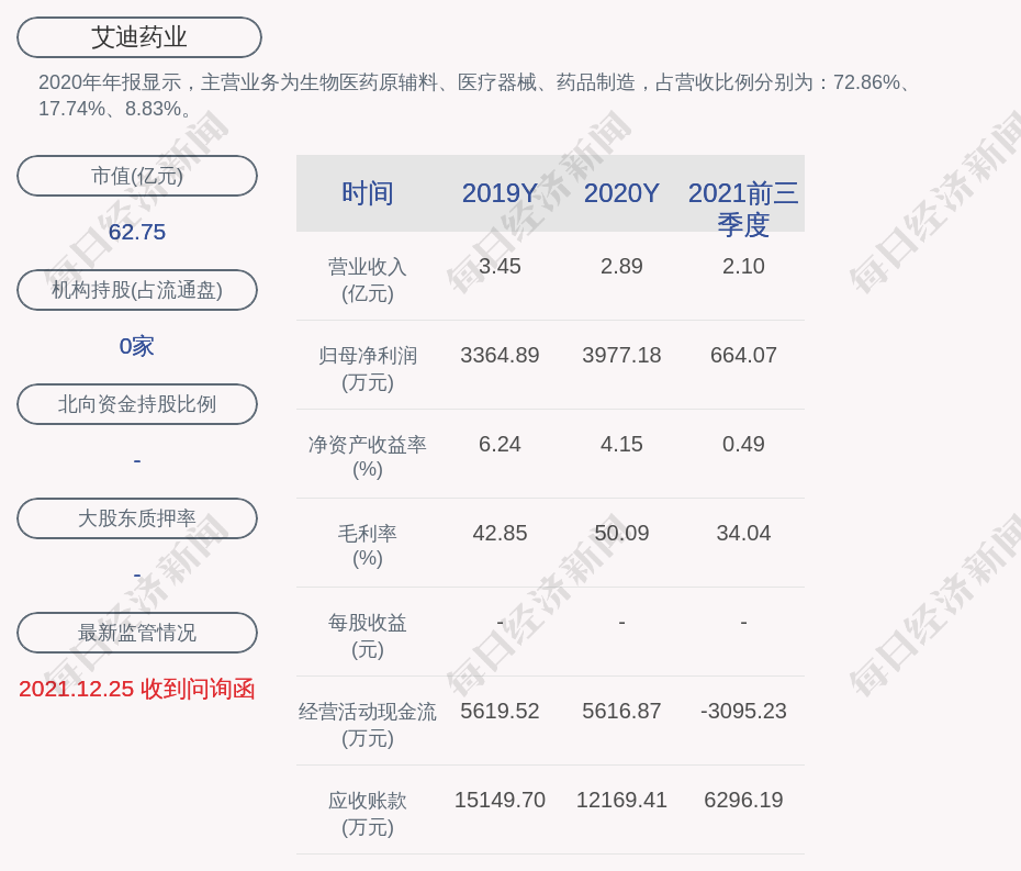 2020年年報(bào)顯示,艾迪藥業(yè)的主營(yíng)業(yè)務(wù)為生物醫(yī)藥原輔料、醫(yī)療器械、藥品制造,占營(yíng)收比例分別為:72.86%、17.74%、8.83%。