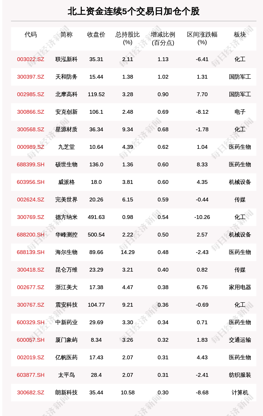 每經(jīng)AI快訊,12月30日,北上資金連續(xù)5個交易日買入68個股。北上資金連續(xù)5個交易日加倉個股中,聯(lián)泓新科(003022.SZ,收盤價:35.31元)增持比例增幅最大,5個交易日增持1.13個百分點,其他增持比例較大的個股包括天和防務(wù)(300397.SZ,收盤價:15.44元)、北摩高科(002985.SZ,收盤價:119.52元)、安克創(chuàng)新(300866.SZ,收盤價:106.1元),分別增持1.02個百分點、0.90個百分點、0.69個百分點。