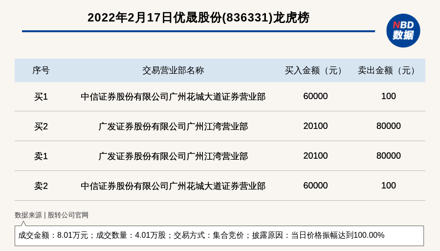每經(jīng)訊,2022年2月17日,新三板基礎(chǔ)層公司優(yōu)晟股份(836331)登上龍虎榜,交易方式是集合競價,披露原因是當日價格振幅達到100.00%,成交數(shù)量4.01萬股,成交金額8.01萬元。買一席位為中信證券股份有限公司廣州花城大道證券營業(yè)部,買入6萬元;賣一席位為廣發(fā)證券股份有限公司廣州江灣營業(yè)部,賣出8萬元。