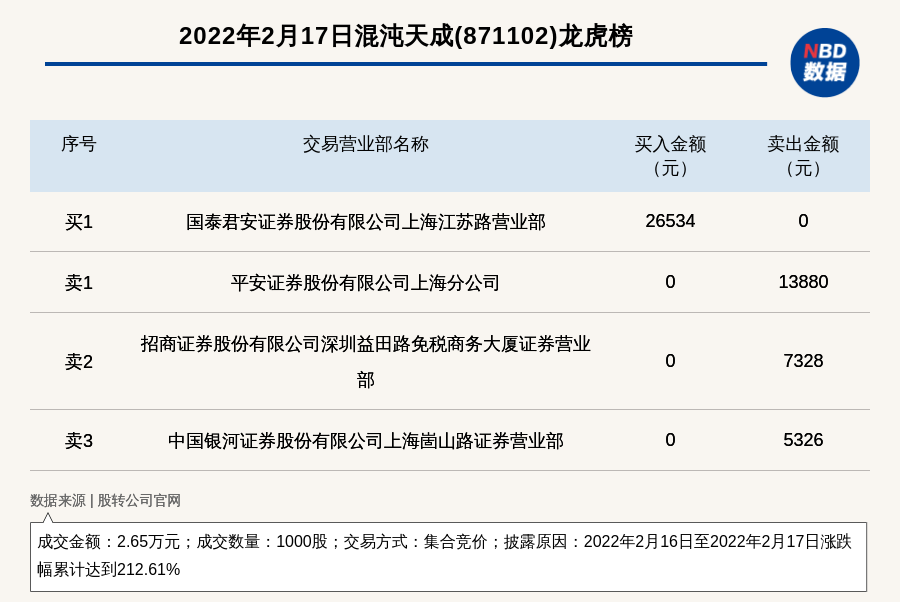 每經(jīng)訊,2022年2月17日,新三板基礎(chǔ)層公司混沌天成(871102)登上龍虎榜,交易方式是集合競價(jià),披露原因是2022年2月16日至2022年2月17日漲跌幅累計(jì)達(dá)到212.61%,成交數(shù)量1000股,成交金額2.65萬元。買一席位為國泰君安證券股份有限公司上海江蘇路營業(yè)部,買入2.65萬元;賣一席位為平安證券股份有限公司上海分公司,賣出1.39萬元。
