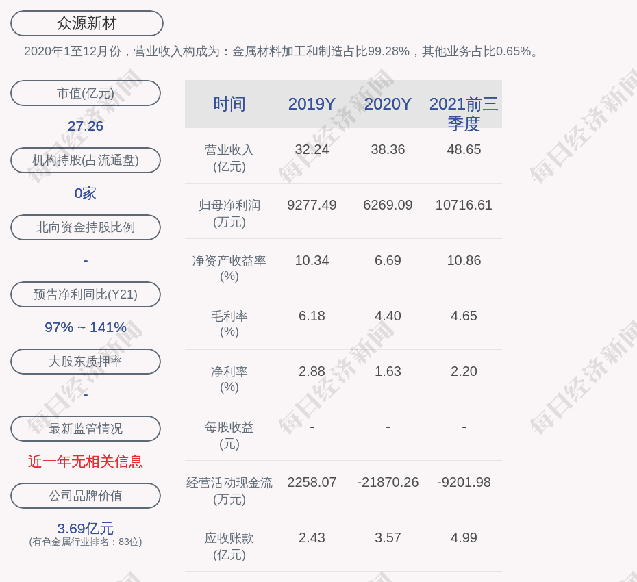 2020年1至12月份,眾源新材的營(yíng)業(yè)收入構(gòu)成為:金屬材料加工和制造占比99.28%,其他業(yè)務(wù)占比0.65%。